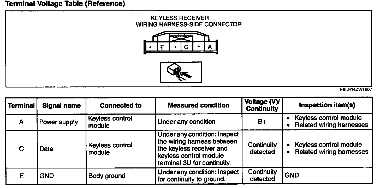 KEYLESS RECEIVER INSPECTION[KEYLESS ENTRY SYSTEM]Terminal Voltage Table (Reference):