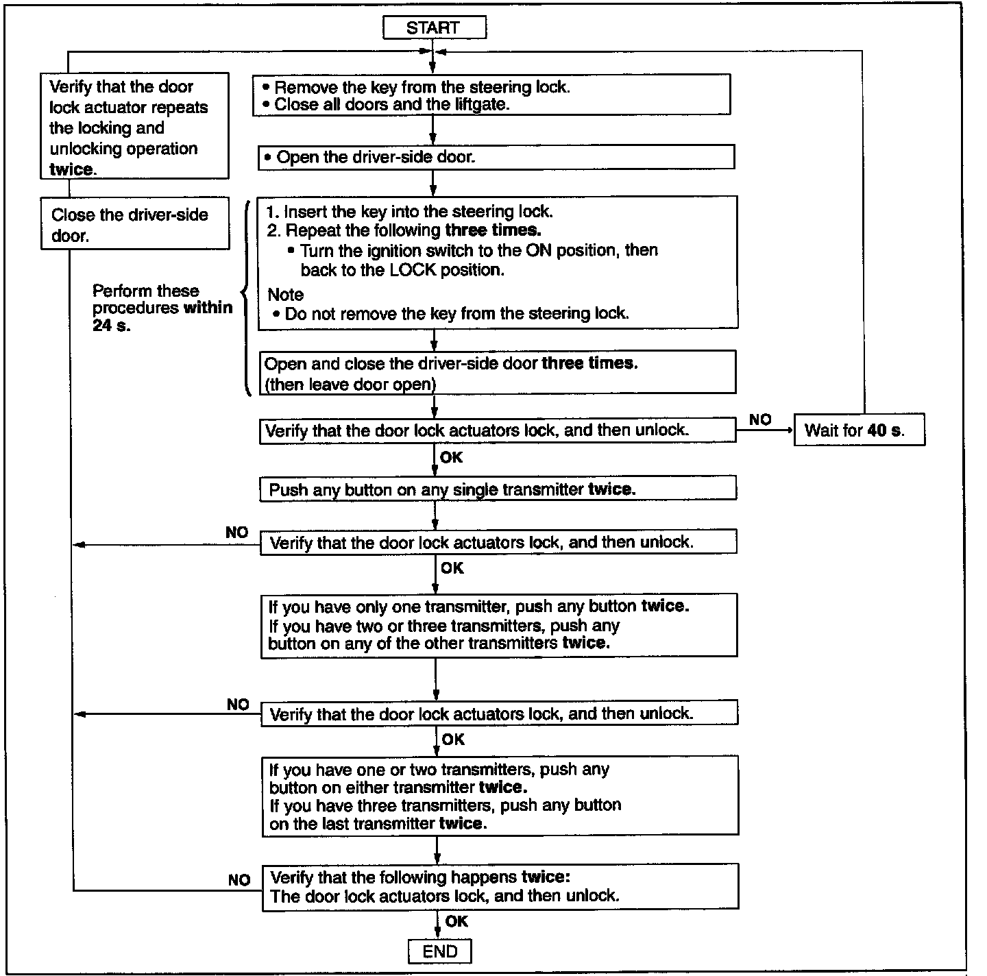 - After ID code programming, remove the key from the steering lock and verify that all doors lock/unlock normally using the transmitter.