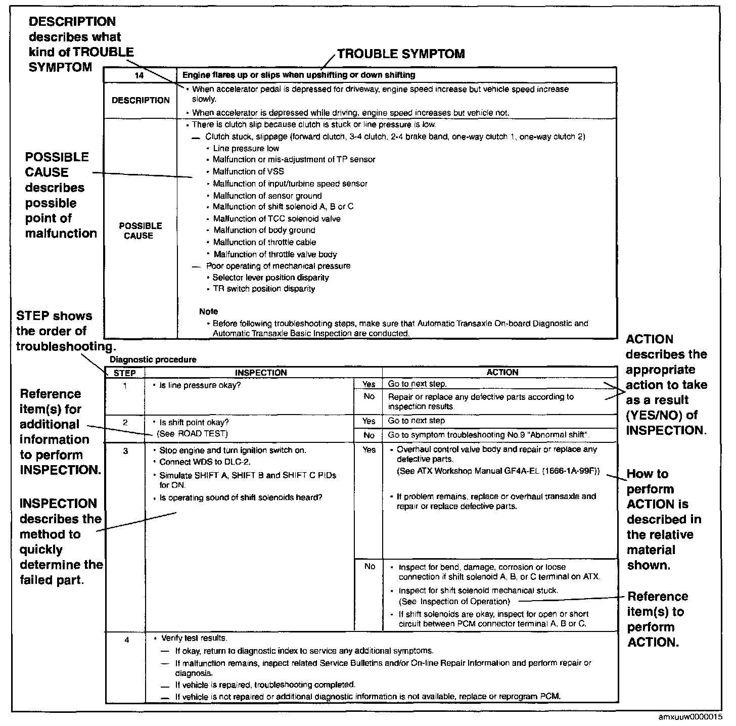 - Symptom troubleshooting shows diagnostic procedures, inspection methods, and proper action to take for each trouble symptom.