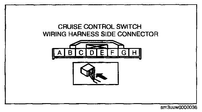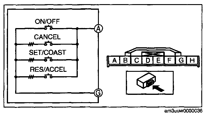 5. Inspect for resistance and continuity between cruise control switch terminals A-G using a tester.