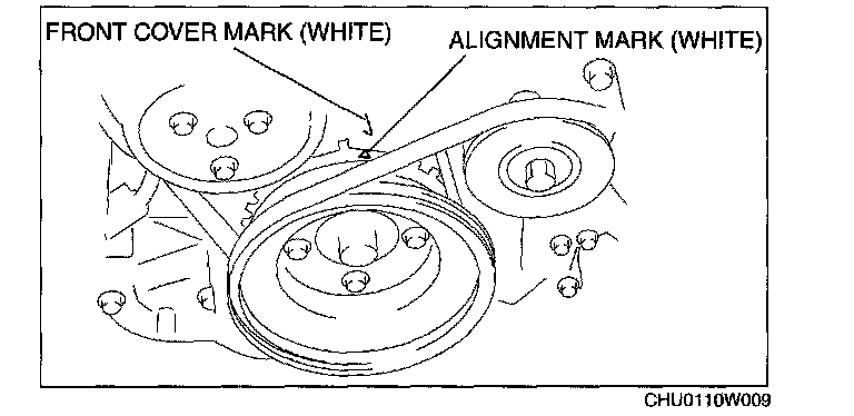 4. Verify that the eccentric shaft position plate alignment mark (white) and the front cover mark (white) is aligned.