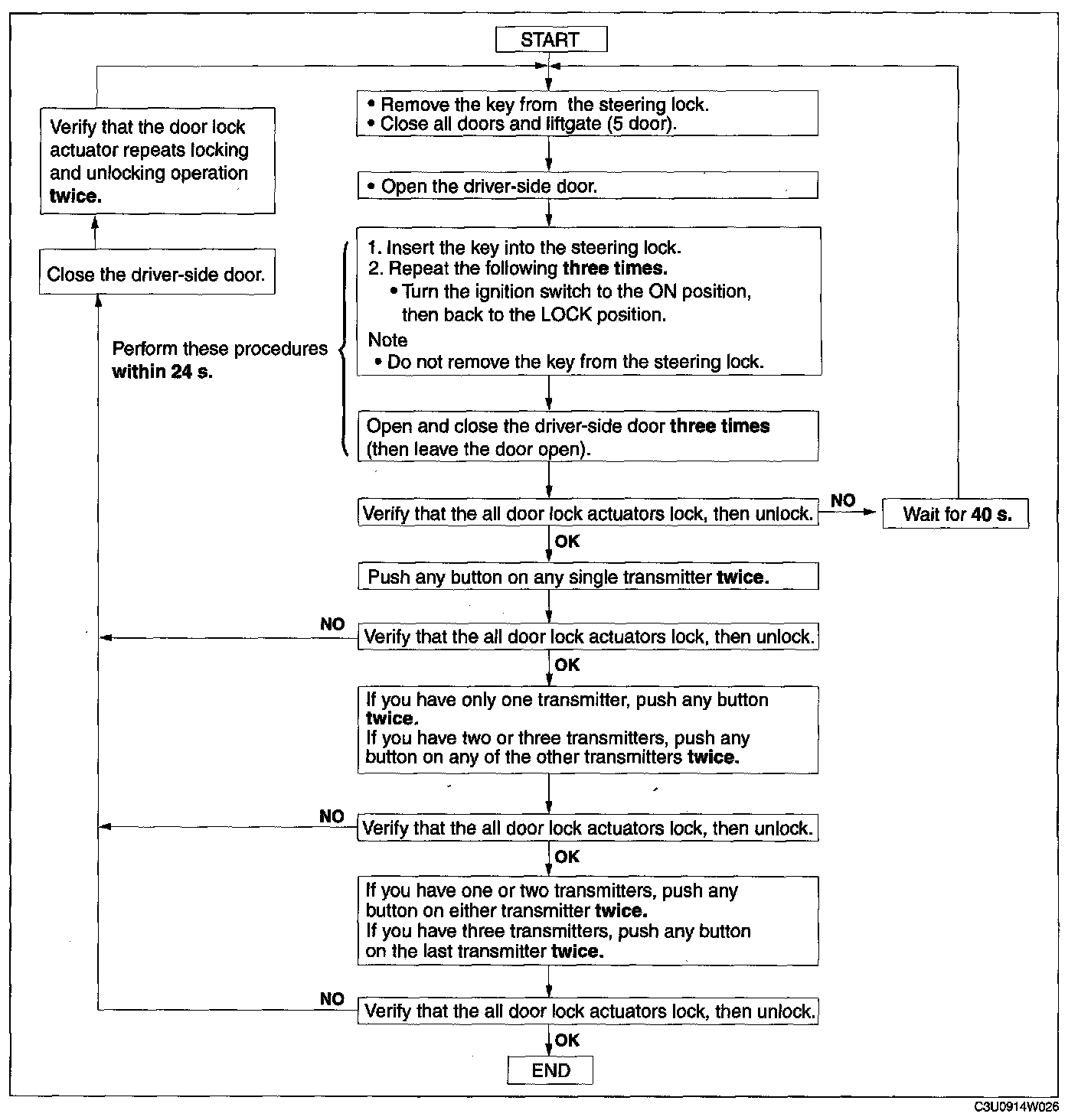 - After ID code registering, remove the key from the steering lock and verify that all doors lock/unlock normally using the transmitter.