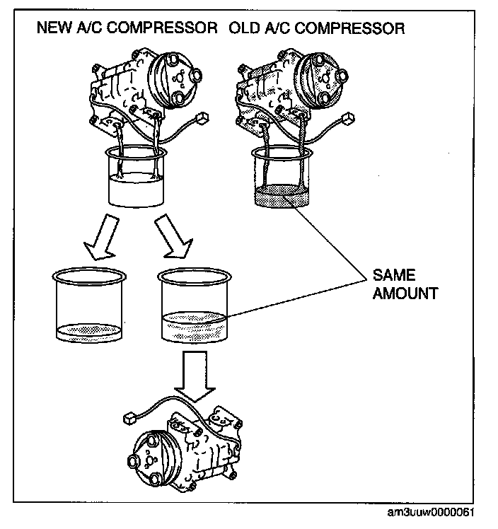 1. Rotate new A/C compressor shaft six to eight revolutions while collecting refrigerant oil in a clean measuring device. Use this refrigerant oil to refill new compressor. Do not allow refrigerant oil to become contaminated.