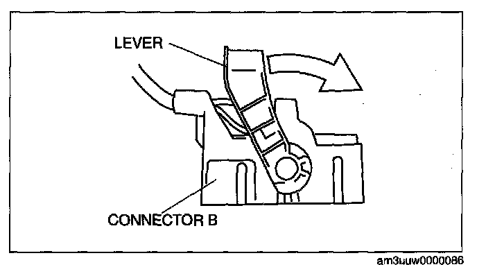 1. Rotate the lever in the direction of the arrow and remove connector B.