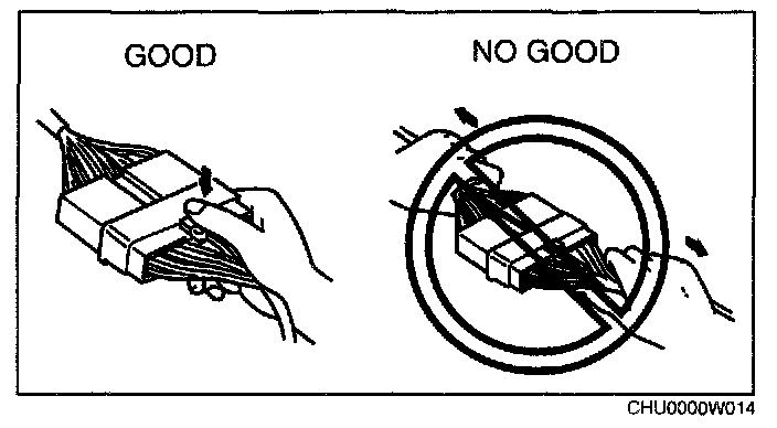 - When a tester is used to inspect for continuity or measuring voltage, insert the tester probe from the wiring harness side.