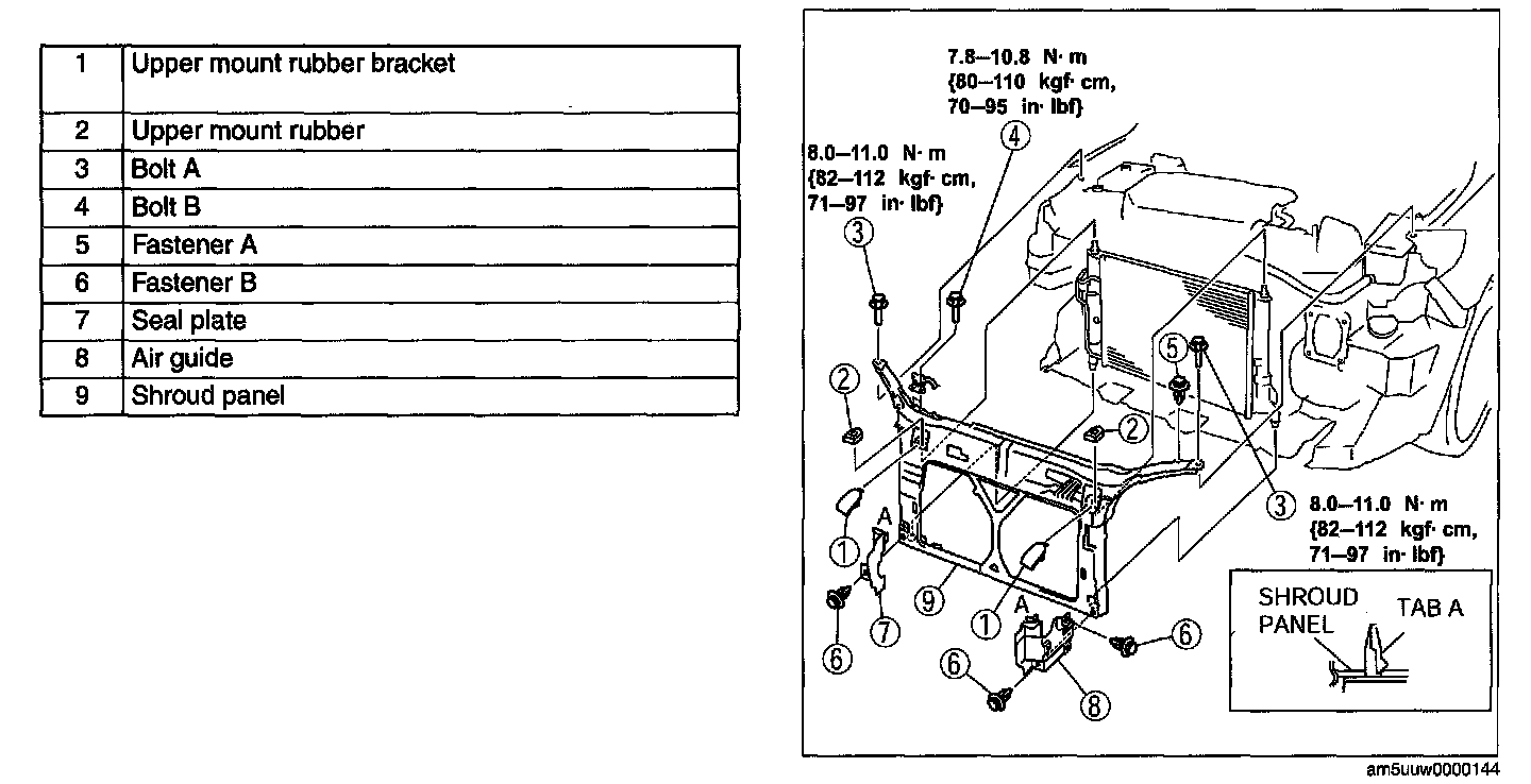 SHROUD PANEL REMOVAL/INSTALLATIONCAUTION: Because the shroud panel is installed to the front bumper reinforcement, support the shroud panel using a jack before removing the front bumper reinforcement so as not to apply excessive force to the shroud panel.