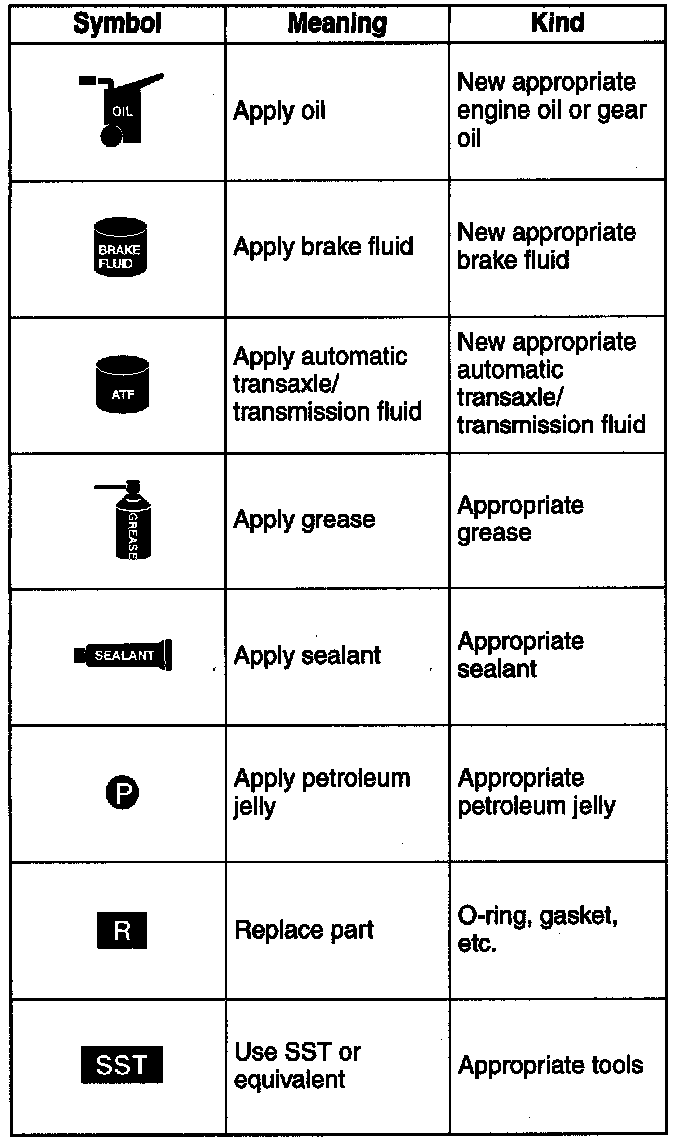 - There are eight symbols indicating oil, grease, fluids, sealant, and the use of SST or equivalent. use. These symbols show application points or use of these materials during service.