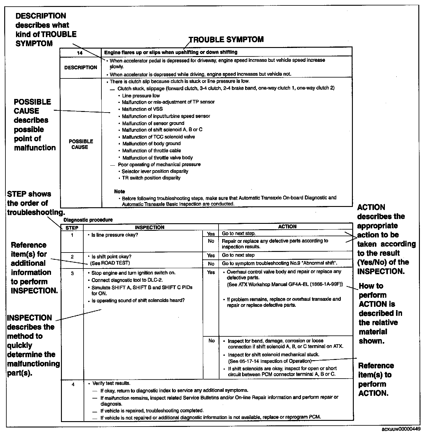 - Symptom troubleshooting shows diagnostic procedures, inspection methods, and proper action to be taken for each trouble symptom.