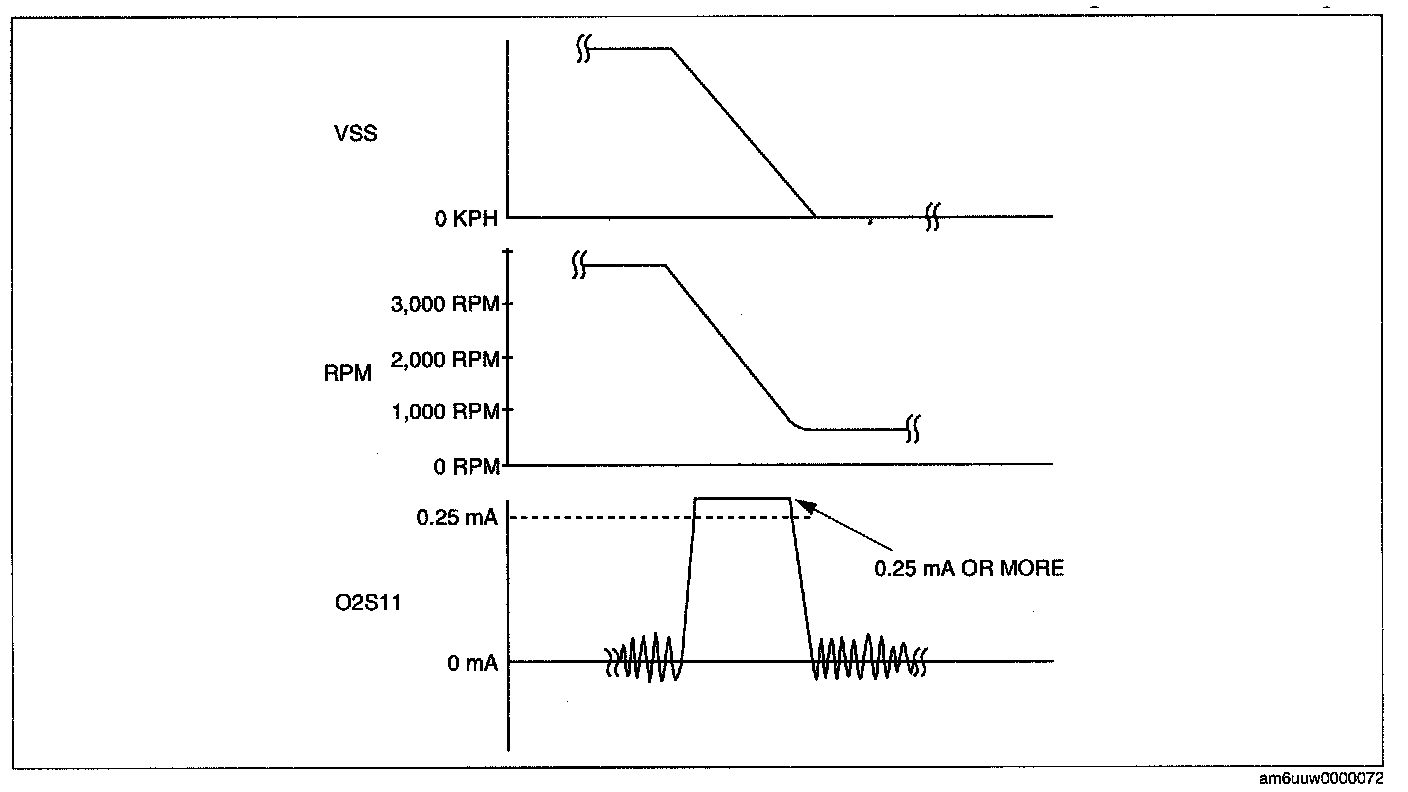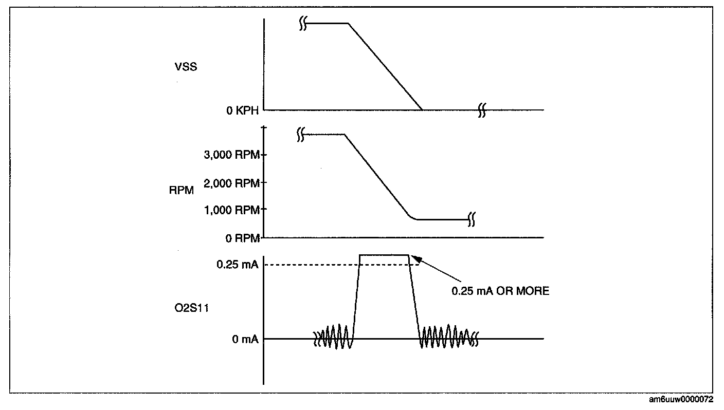 4. Verify that the front HO2S current (PID: 02S11) is 0.25 mA or more while decelerating as shown in the figure.