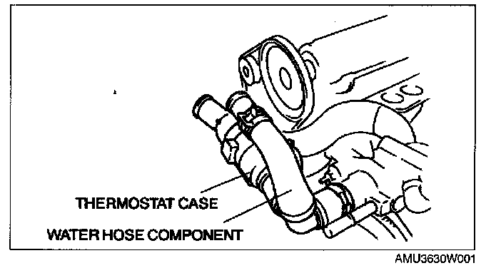 8. Remove the thermostat case and water hose component.