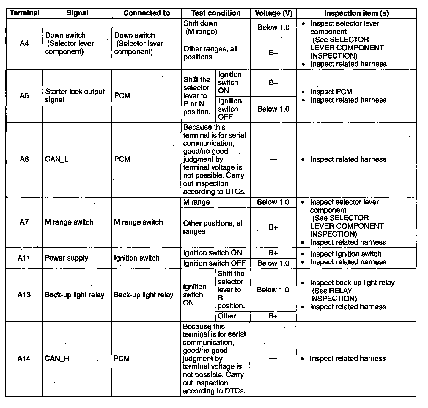 ^ Use the ground of terminal A9 of the TCM connector (wiring harness-side) when measuring terminal voltage, as an error may occur when connecting the negative circuit tester to ground.