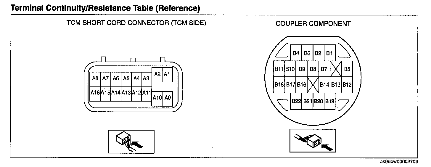 4. Verify that continuity or resistance at terminal is as indicated in the terminal continuity/resistance table.
