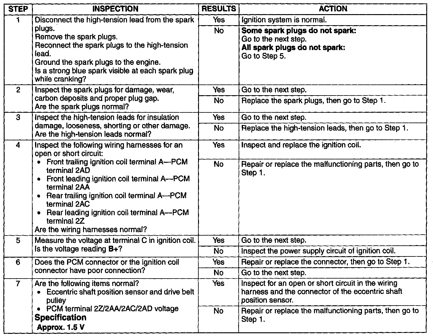 WARNING: High voltage in the ignition system can cause strong electrical shock which can result in serious injury. Avoid direct contact to the vehicle body during the following spark test.