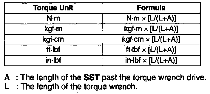 - When using a torque wrench-SST or equivalent combination, the specified torque must be recalculated due to the extra length that the SST or equivalent adds to the torque wrench. Recalculate the torque by using the following formulas. Choose the formula that applies to you.
