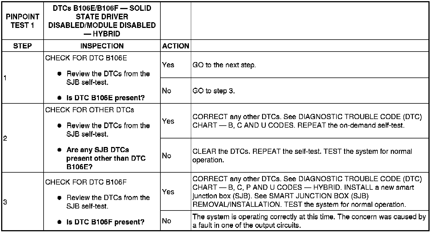 PINPOINT TEST 1: DTCs B106E/B106F - SOLID STATE DRIVER DISABLED/MODULE DISABLED - HYBRID