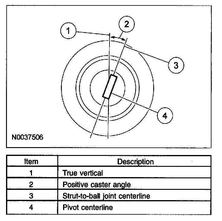Caster is the deviation from vertical of an imaginary line drawn through the pivot points (top of strut and lower ball joint), when viewed from the side. The caster specifications will give the vehicle the best directional stability characteristics when loaded and driven. The caster setting is not related to tire wear. The caster setting is not adjustable.