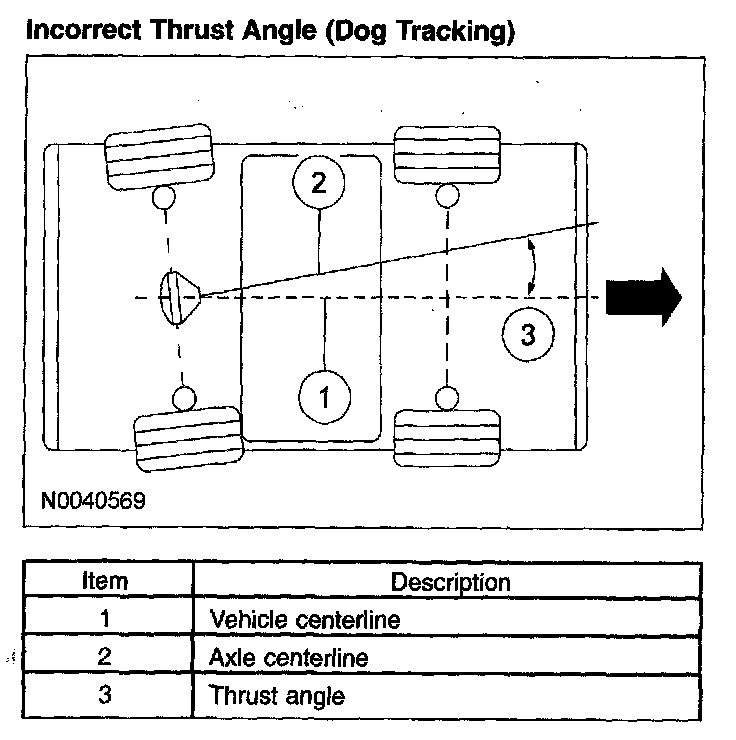 Incorrect thrust angle (also known as dogtracking) is the condition in which the rear axle is not square to the chassis. Heavily crowned roads can give the illusion of dogtracking.