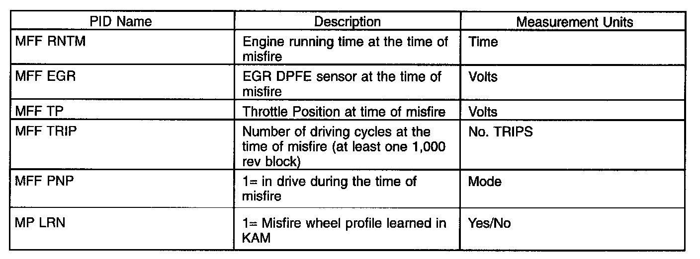 Some unique PIDs are stored in the Keep Alive Memory of the (KAM) of the PCM to help in diagnosing the root cause of misfires. These PIDs are collectively called misfire freeze4rame (MFF) data. These parameters are separate from the generic freeze-frame data that is stored for every MIL code. They are used for misfire diagnosis only. The MFF data could be more useful for misfire diagnosis than the generic freeze frame data. It is captured at the time of the highest misfire rate, and not when the DTC is stored at the end of a 1,000 or 200 revolution block. (Generic freeze-frame data for misfire can be stored minutes after the misfire actually occurred).