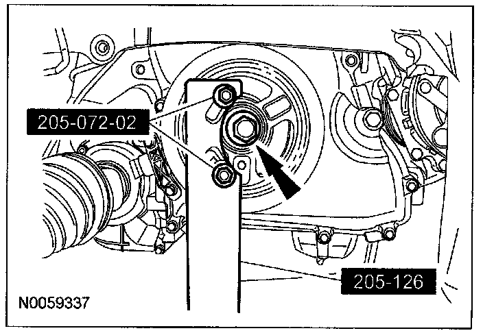 Install a new crankshaft pulley bolt. Using the special tools to hold the crankshaft pulley in place, tighten the crankshaft pulley bolt in two stages: