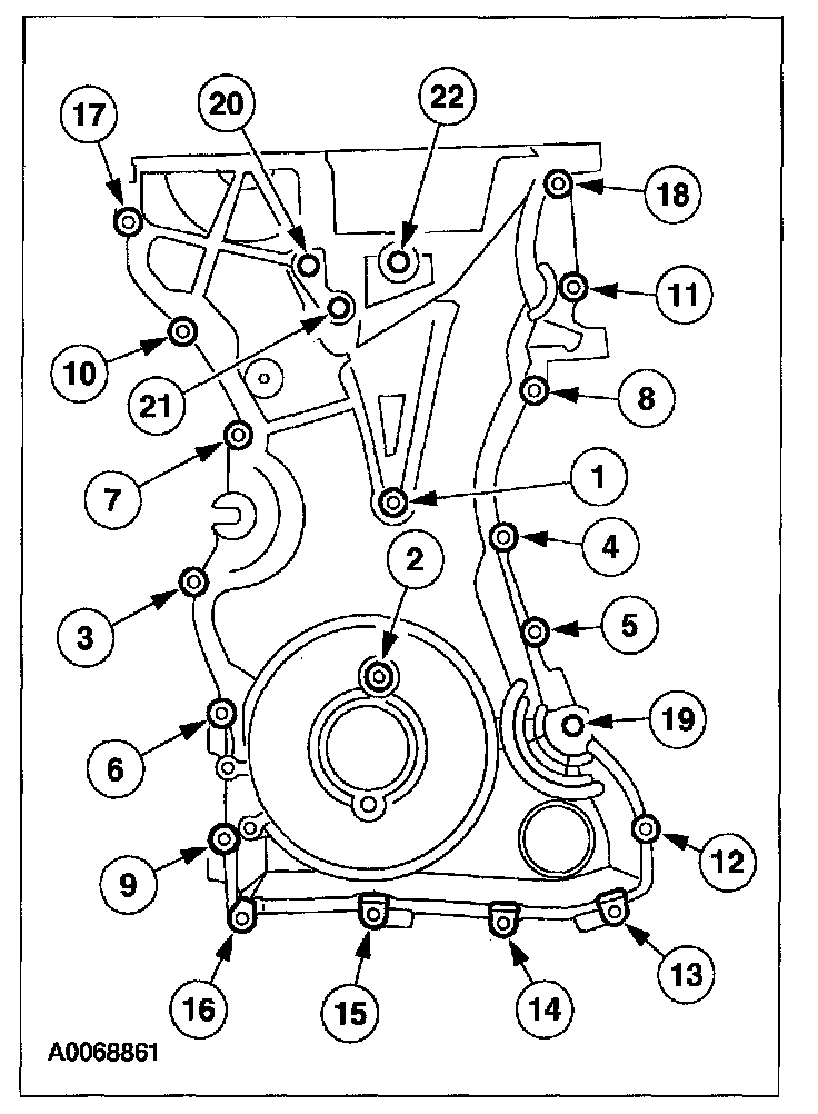 Install the engine front cover. Tighten the bolts in the sequence shown, to the following specifications: