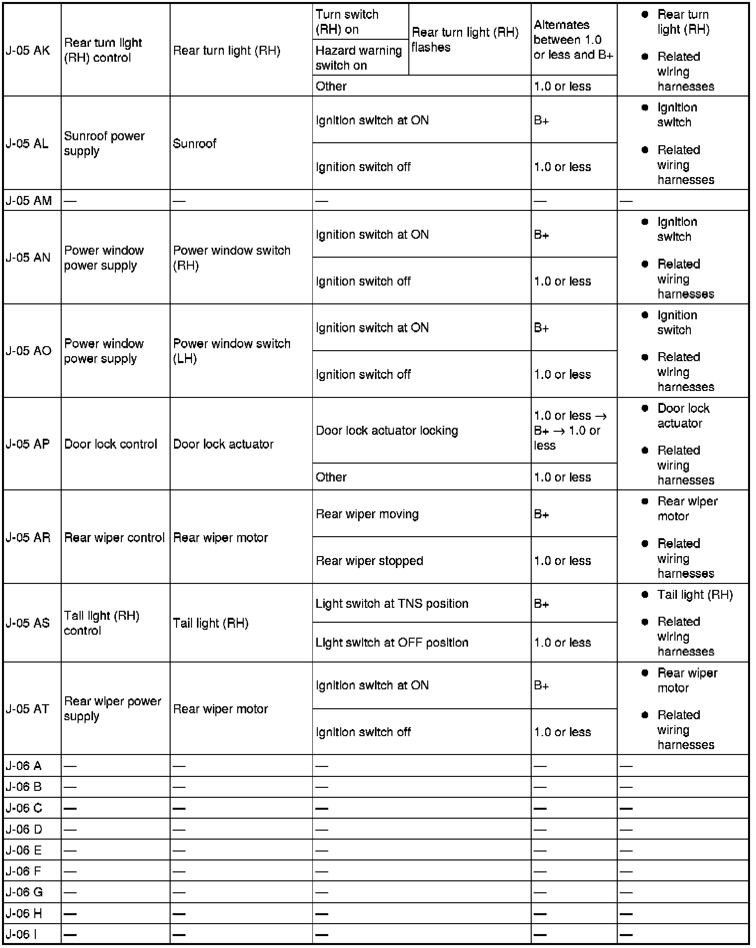 - If the voltage or continuity is not as specified in the Terminal Voltage Table (Reference), inspect the parts under "Inspection item (s)".