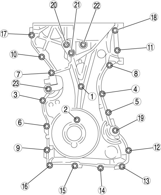 Install the engine front cover bolts in the order shown in the figure.
