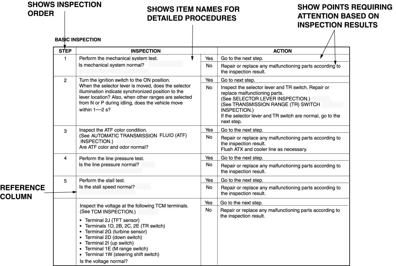 - Although inspections and adjustments are performed according to the reference column procedures, if the cause of the malfunction is discovered during basic inspection, continue the procedures as indicated in the action column.