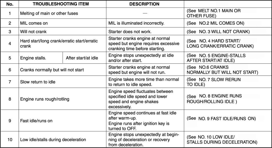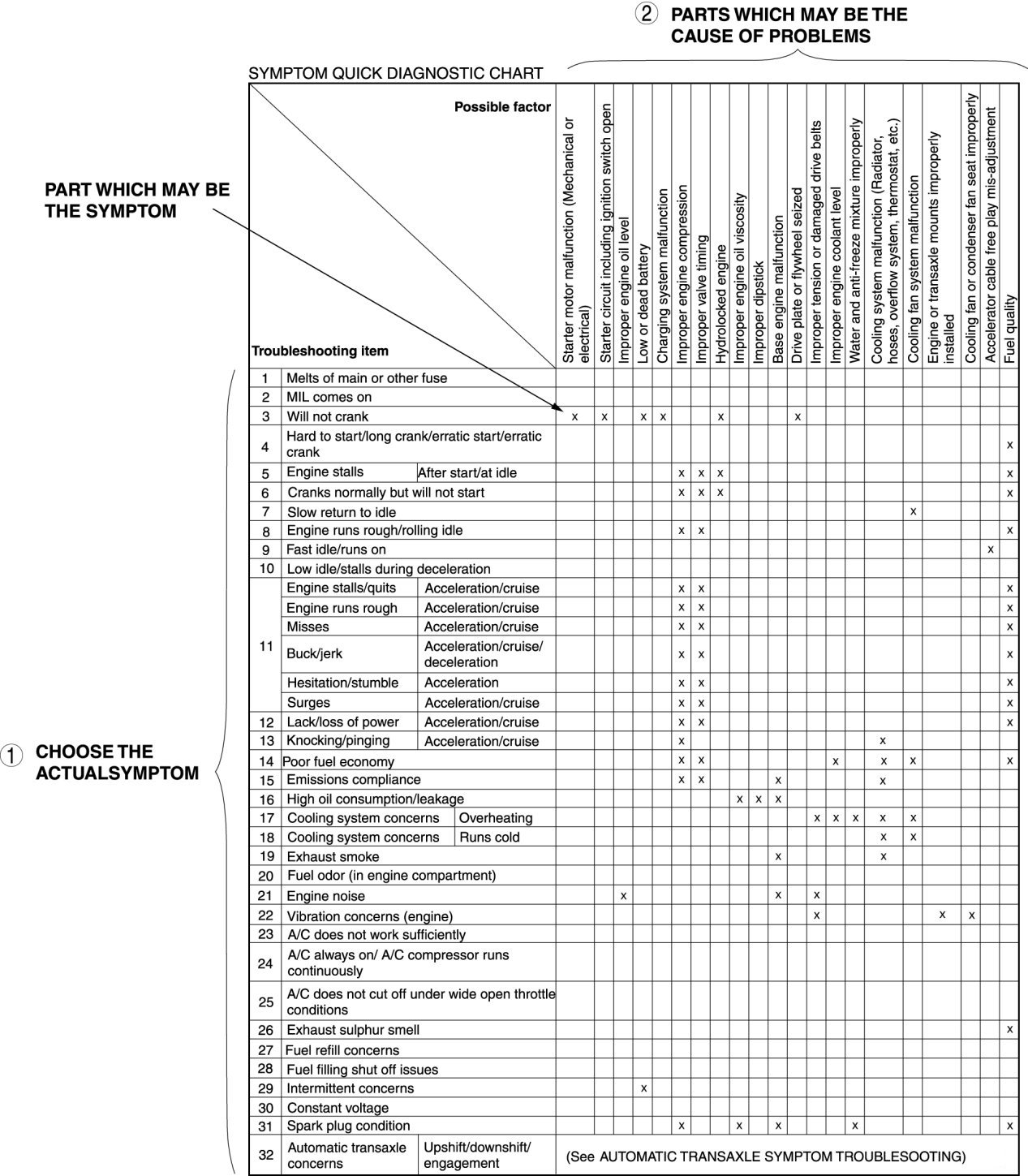 - The chart is effective in quickly narrowing down the relation between symptom and cause of the malfunction. It also specifies the area of the common cause when multiple malfunction symptoms occur.