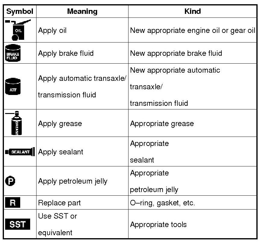 - There are eight symbols indicating oil, grease, fluids, sealant, and the use of SST or equivalent. These symbols show application points or use of these materials during service.