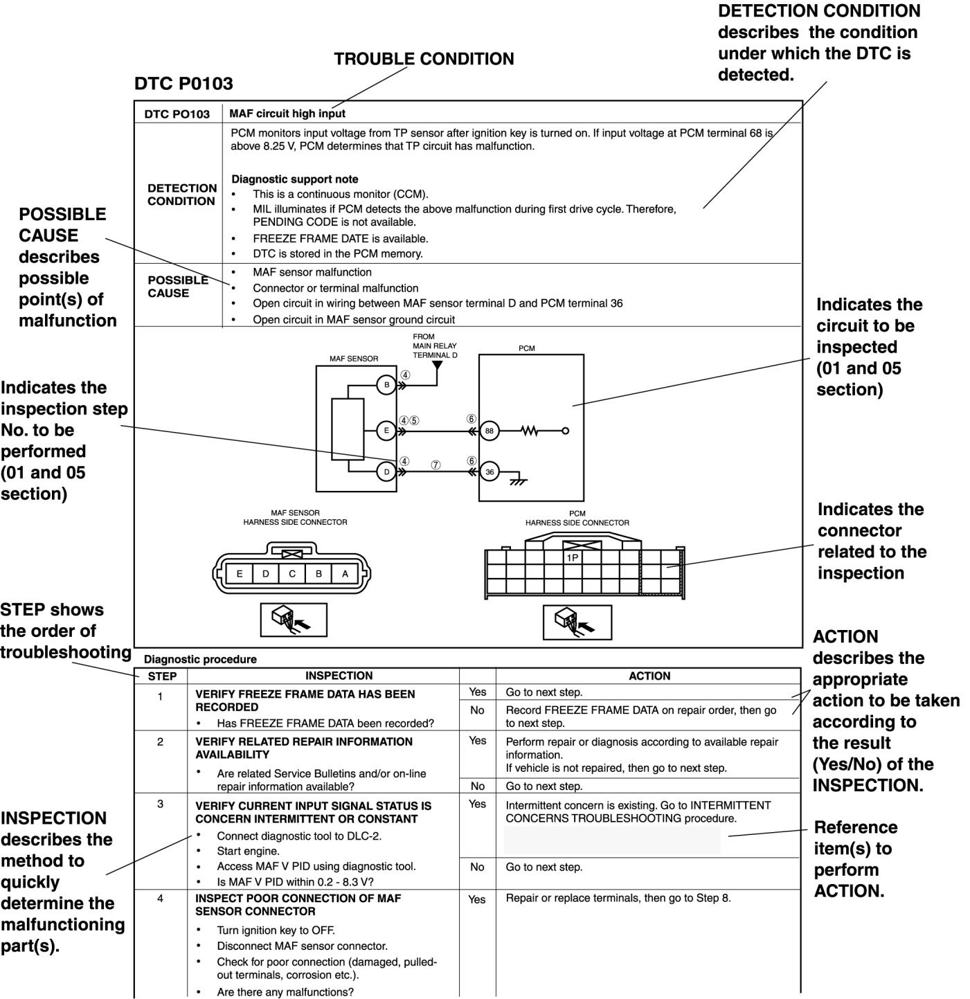 - DTC troubleshooting flow shows diagnostic procedures, inspection methods, and proper action to take for each DTC.