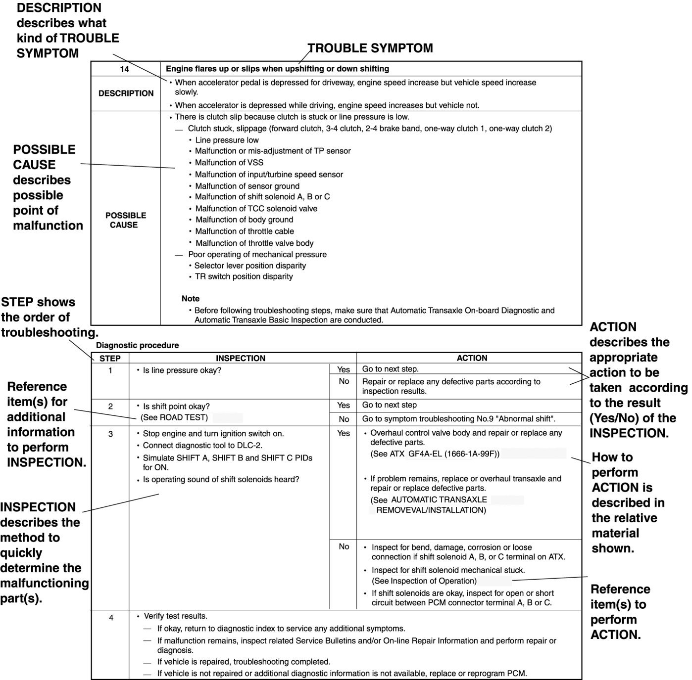 - Symptom troubleshooting shows diagnostic procedures, inspection methods, and proper action to take for each trouble symptom.