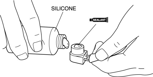 1. Apply approx. 1 g {0.04 oz} of silicone (Shin-Etsu Silicone KE-347W or similar) to the contact surface of the thermal protector, then thoroughly install it onto the A/C compressor, leaving no gaps.
