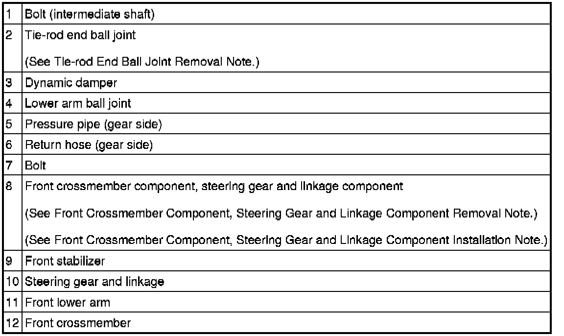 Front Crossmember Component, Steering Gear and Linkage Component Removal Note