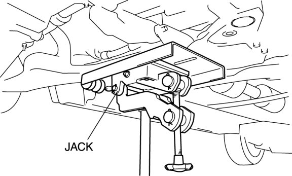 3. Raise the transmission jack gradually and install the front crossmember to the vehicle. At this point verify that the SST is securely inserted in the positioning holes on the body.