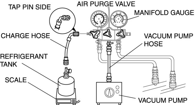 - Always being charging of refrigerant from the high-pressure side. If changing is begun from the low-pressure side, the vanes of the A/C compressor will not be released and abnormal noise may result.
