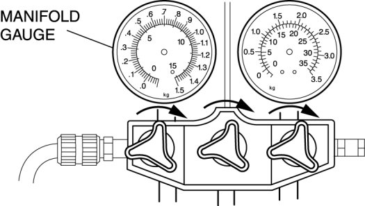 3. Verify that high- and low-pressure side readings of the manifold gauge are at -101 kPa {-760 mmHg, -29.9 inHg}. Close each valve of the manifold gauge.