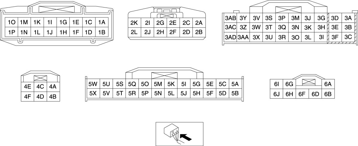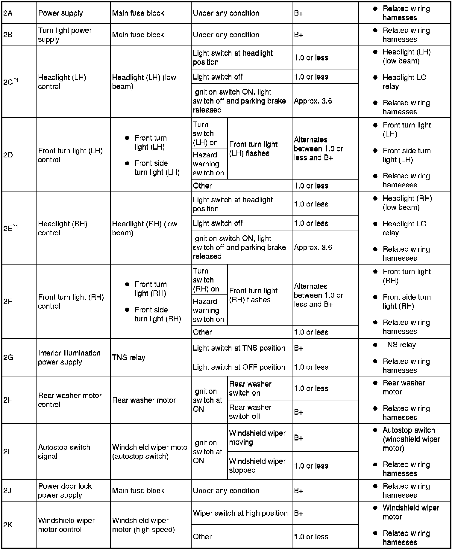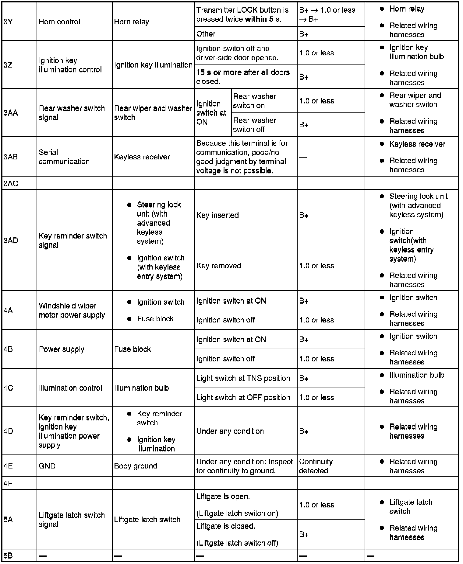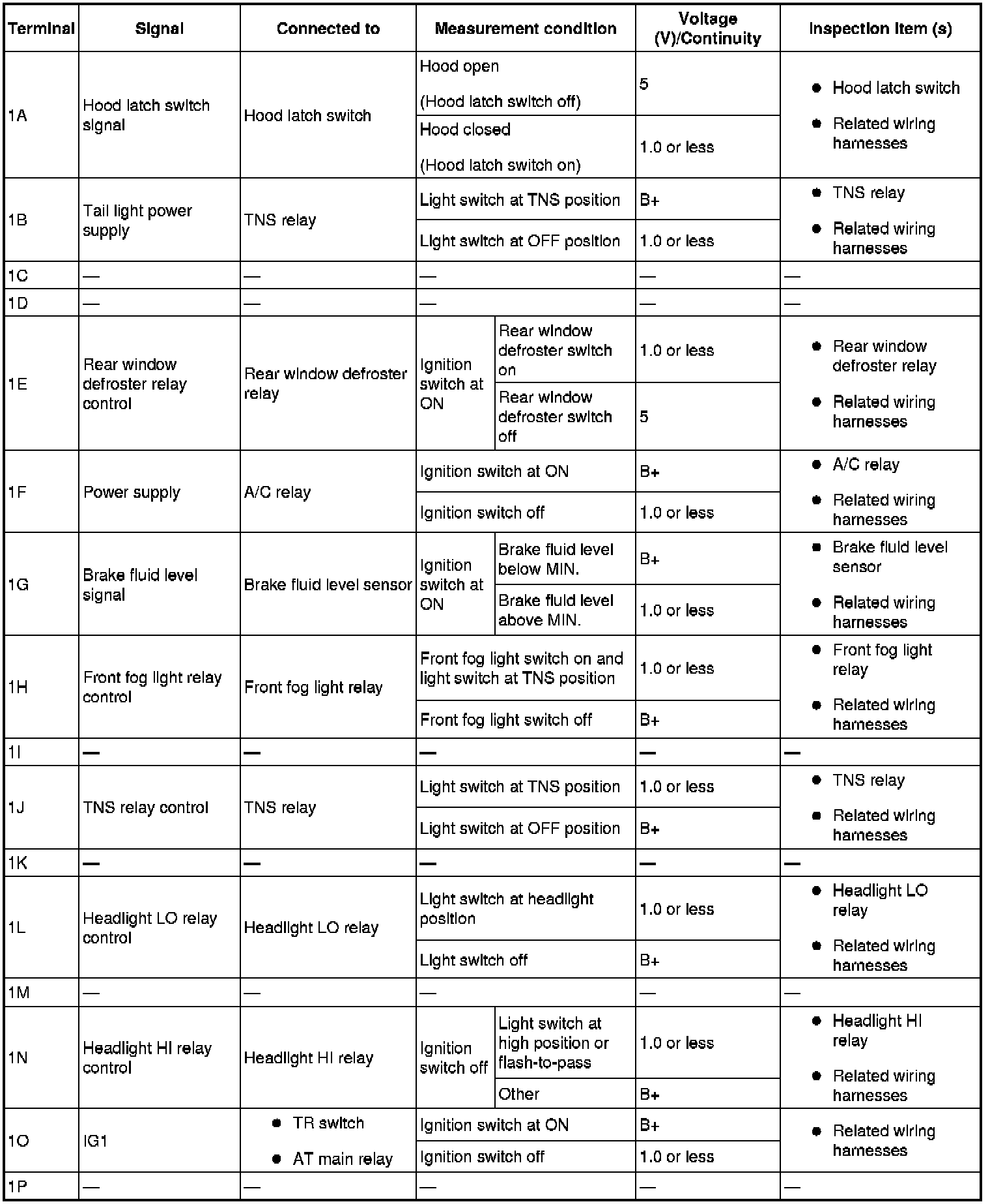 - If the voltage or continuity is not as specified in the Terminal Voltage Table (Reference), inspect the parts under "Inspection item (s)".