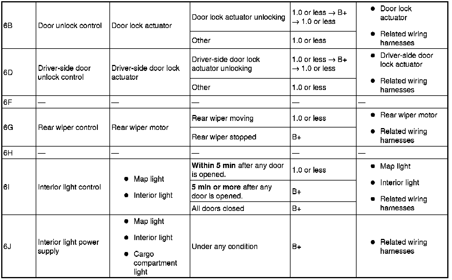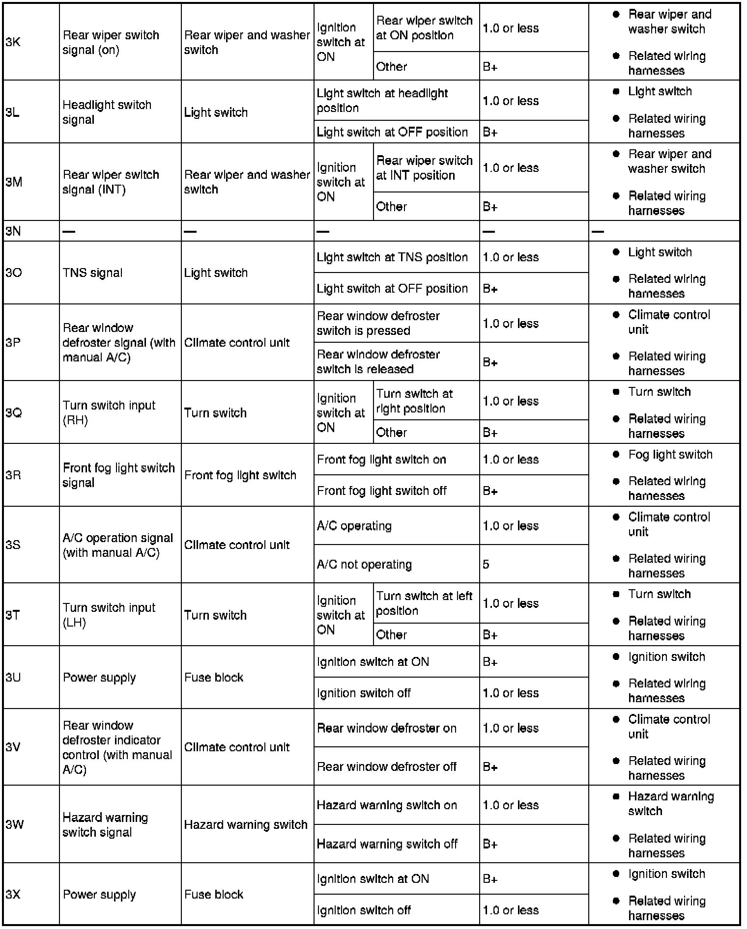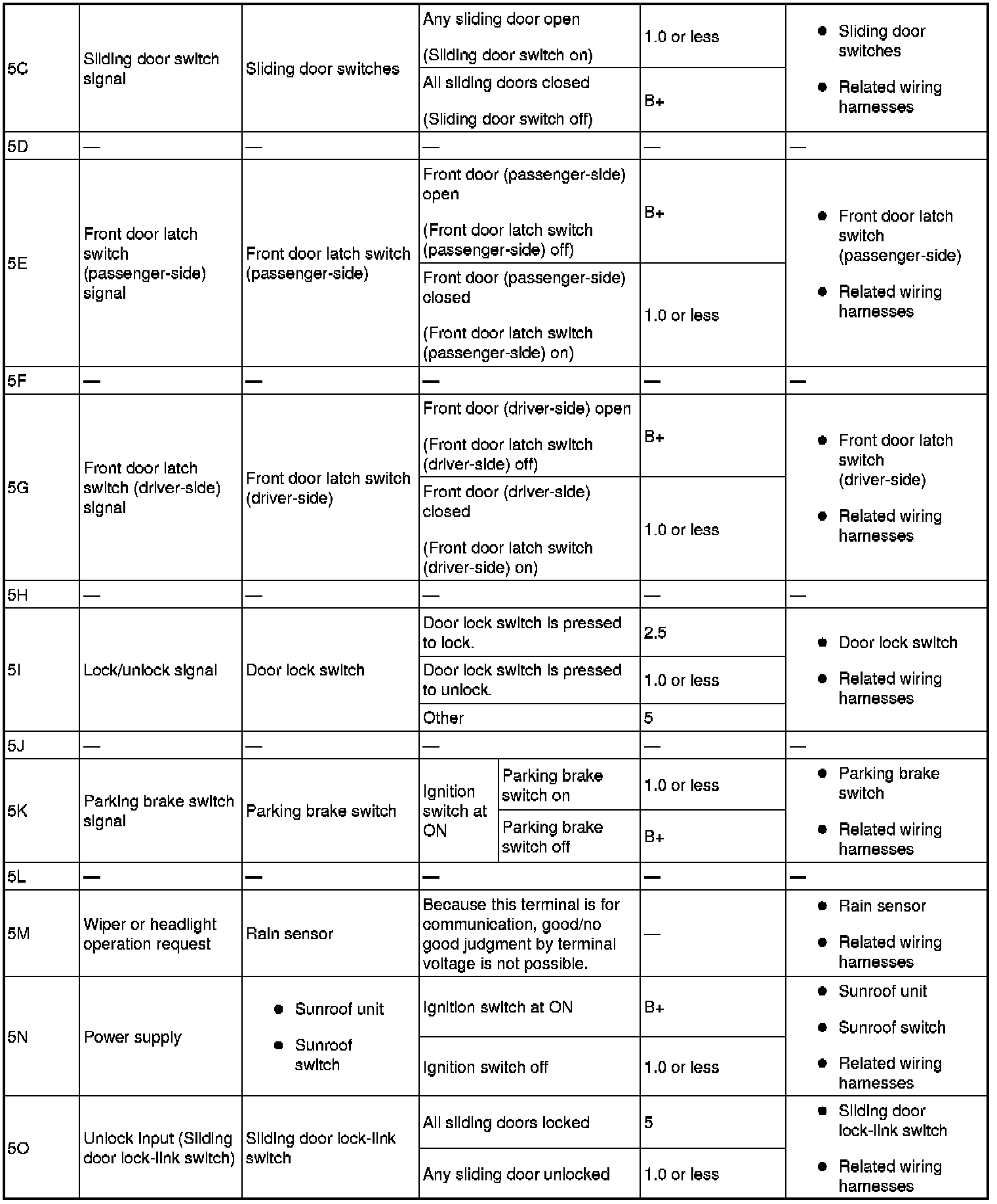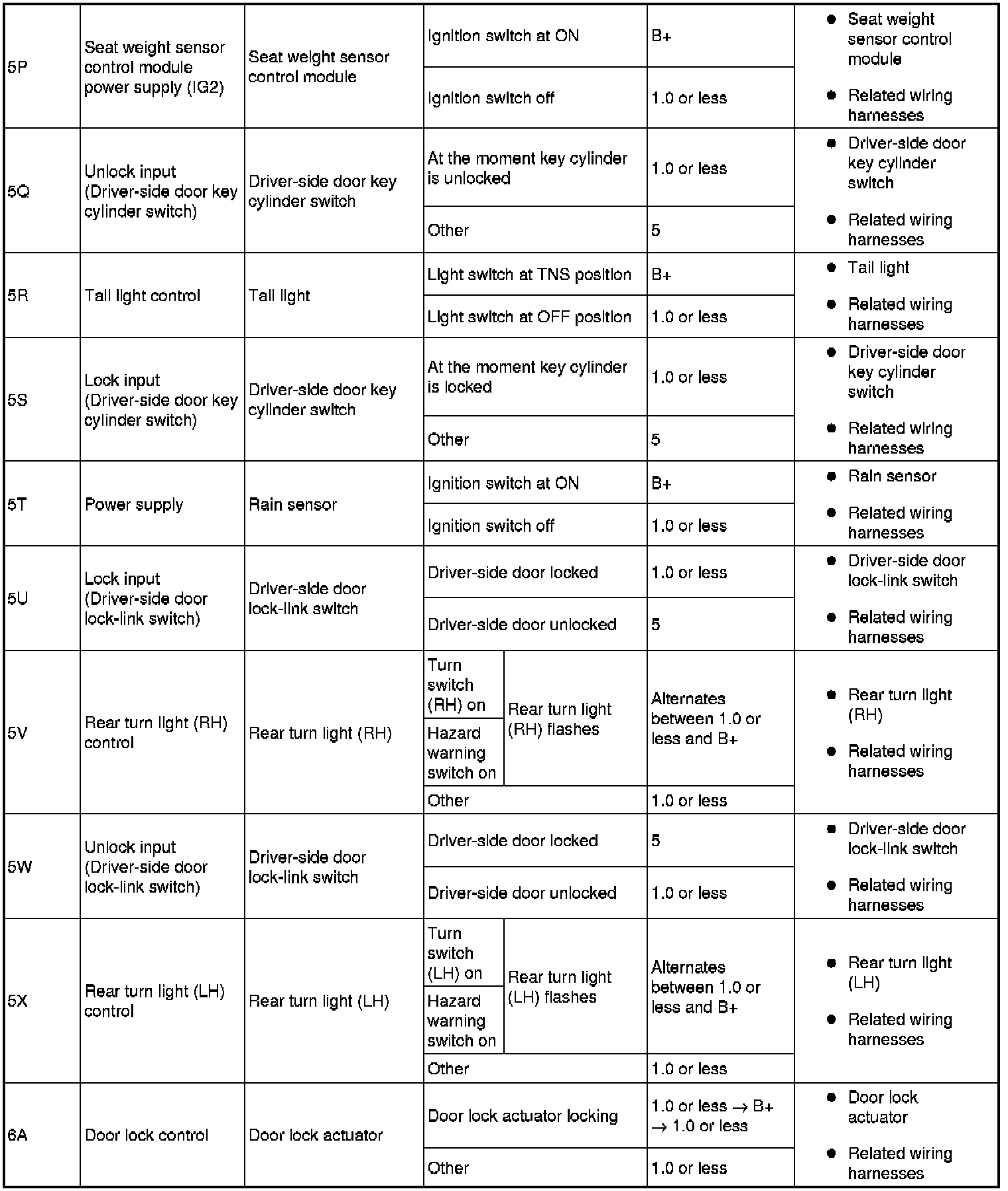 - If the voltage or continuity is not as specified in the Terminal Voltage Table (Reference), inspect the parts under "Inspection item (s)".