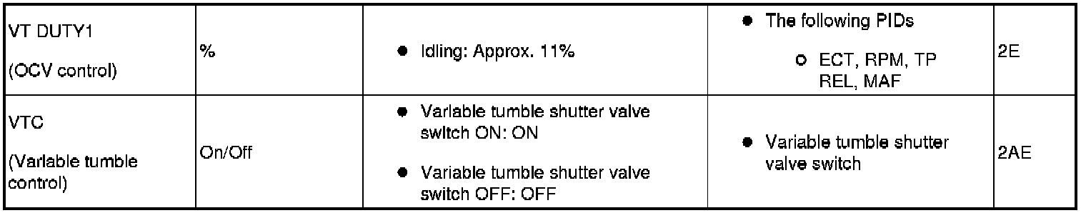 - ACCS, ALTF, ARPMDES, EVAPCP, FAN_DUTY, FP, FUELPW1, GENVDSD, HTR11, HTR12, IMRC, IMTV, INJ_1, INJ_2, INJ_3, INJ_4, SEGRP, test, VT DUTY1 Wt