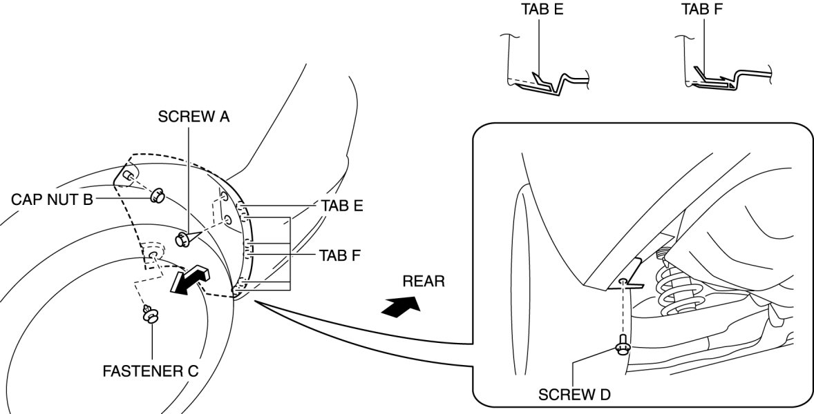 1. Remove the screws and cap nut then remove the splash shield in the direction of the arrow shown in the figure.