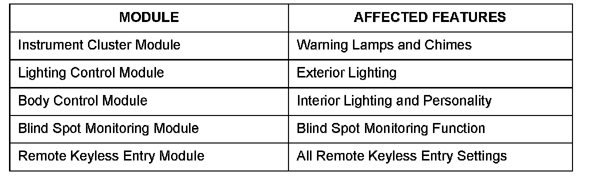 During certain repairs, module replacement may be necessary. When replacing a module that retains "Personalization" feature settings (see "Affected Modules" below), the settings for that module will return to the default, if PMI cannot be performed. The customer's "Personalization" settings will need to be recorded and re-set after the module is replaced. Depending on the module condition, technicians may not be able to retrieve the customer's "Personalization" settings related to that module. In these cases, it is important to retrieve the customer's preferred setting(s) prior to the customer leaving the dealership.