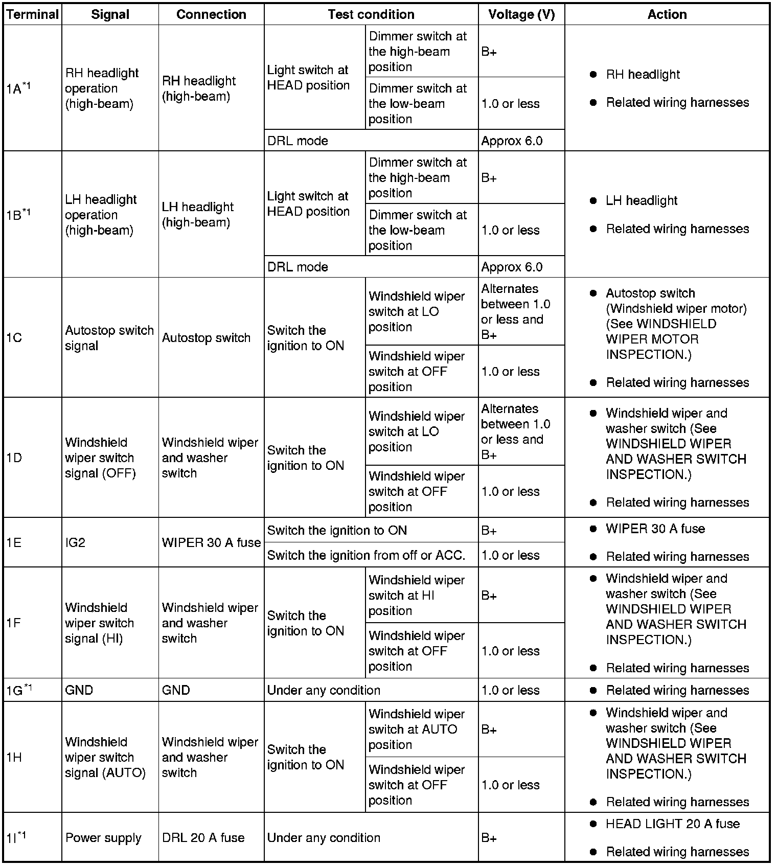 1. Measure the voltage at the auto light/wiper control module terminals as indicated below.