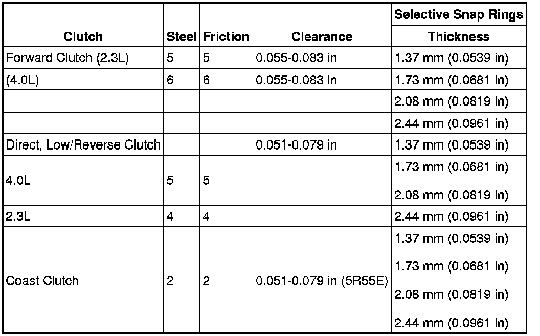 Clutch Plate Usage And Clearance Specifications (5R44E and 5R55E)