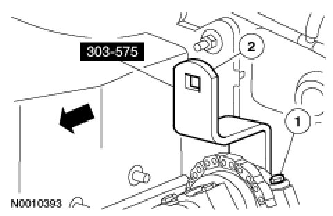 NOTE:Late build vehicles shown, early build vehicles similar.Install the camshaft sprocket holding tool SST and the adaptor SST to the RH cylinder head and tighten the 2 top clamp bolts.Tightening Torque10 Nm {1.0 kgf-m, 89 in-lbf}
