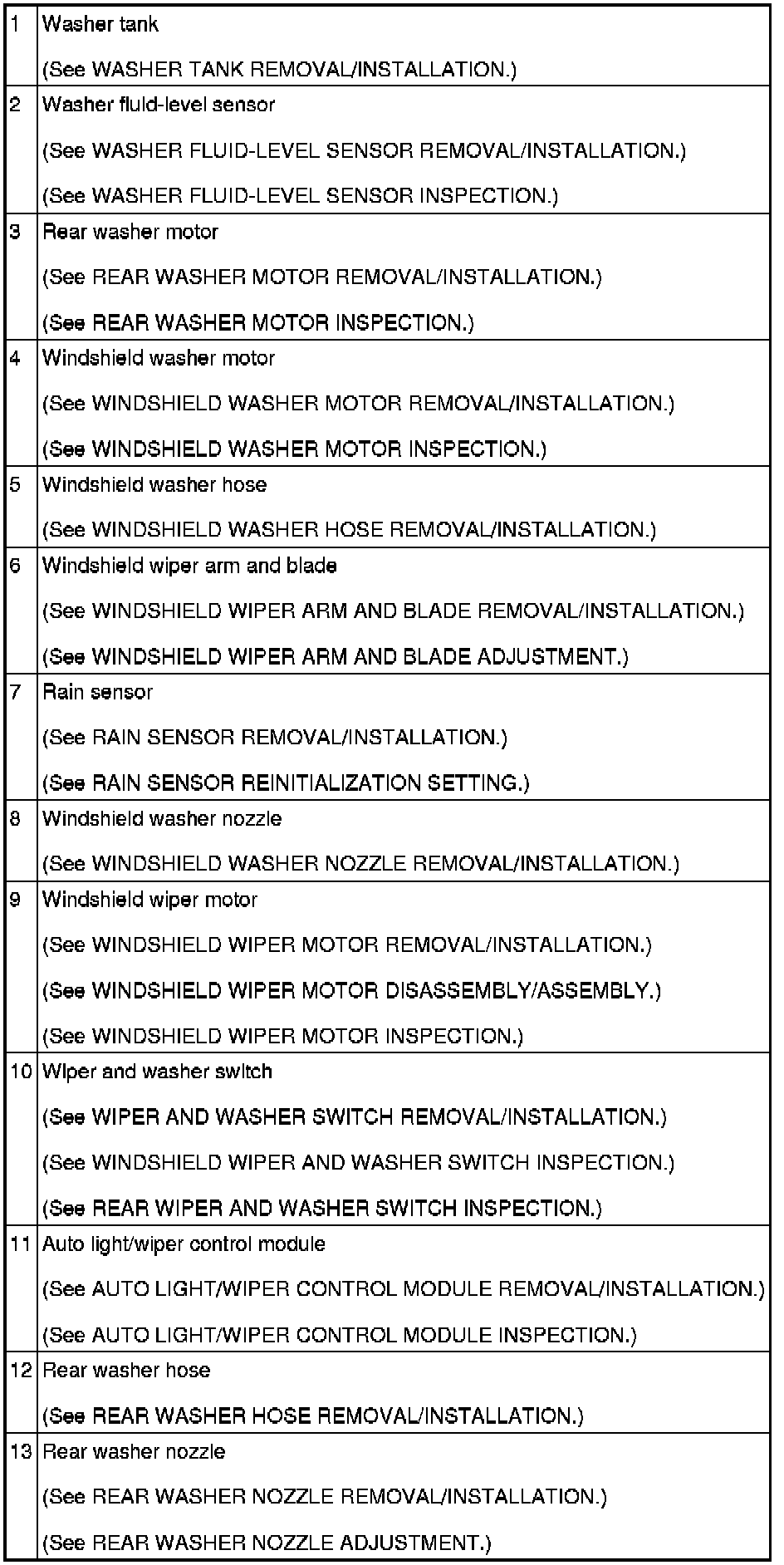 WIPER/WASHER SYSTEM LOCATION INDEX