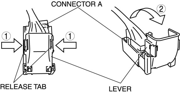 2. Rotate the lever in the direction of the arrow and remove connector A.