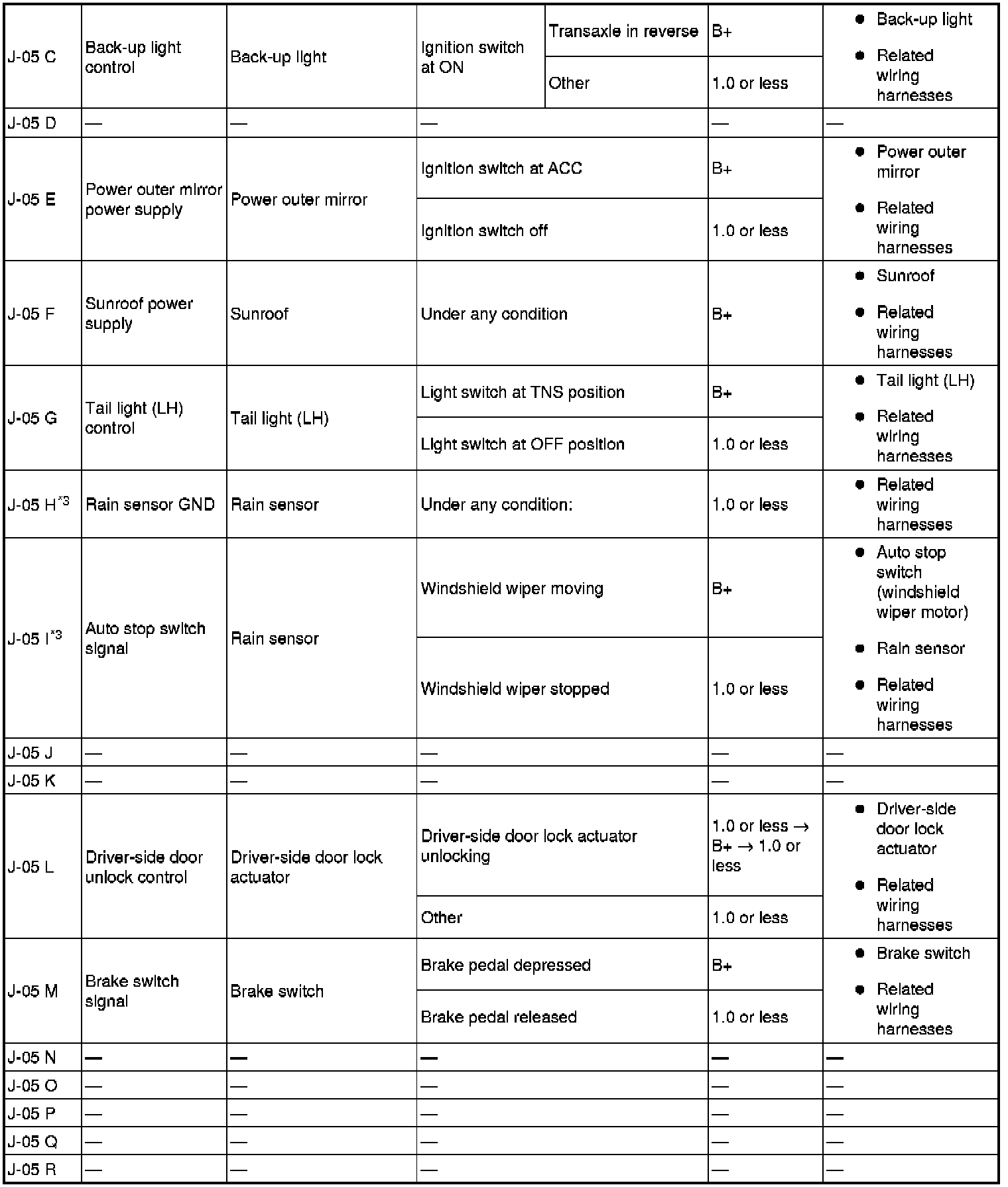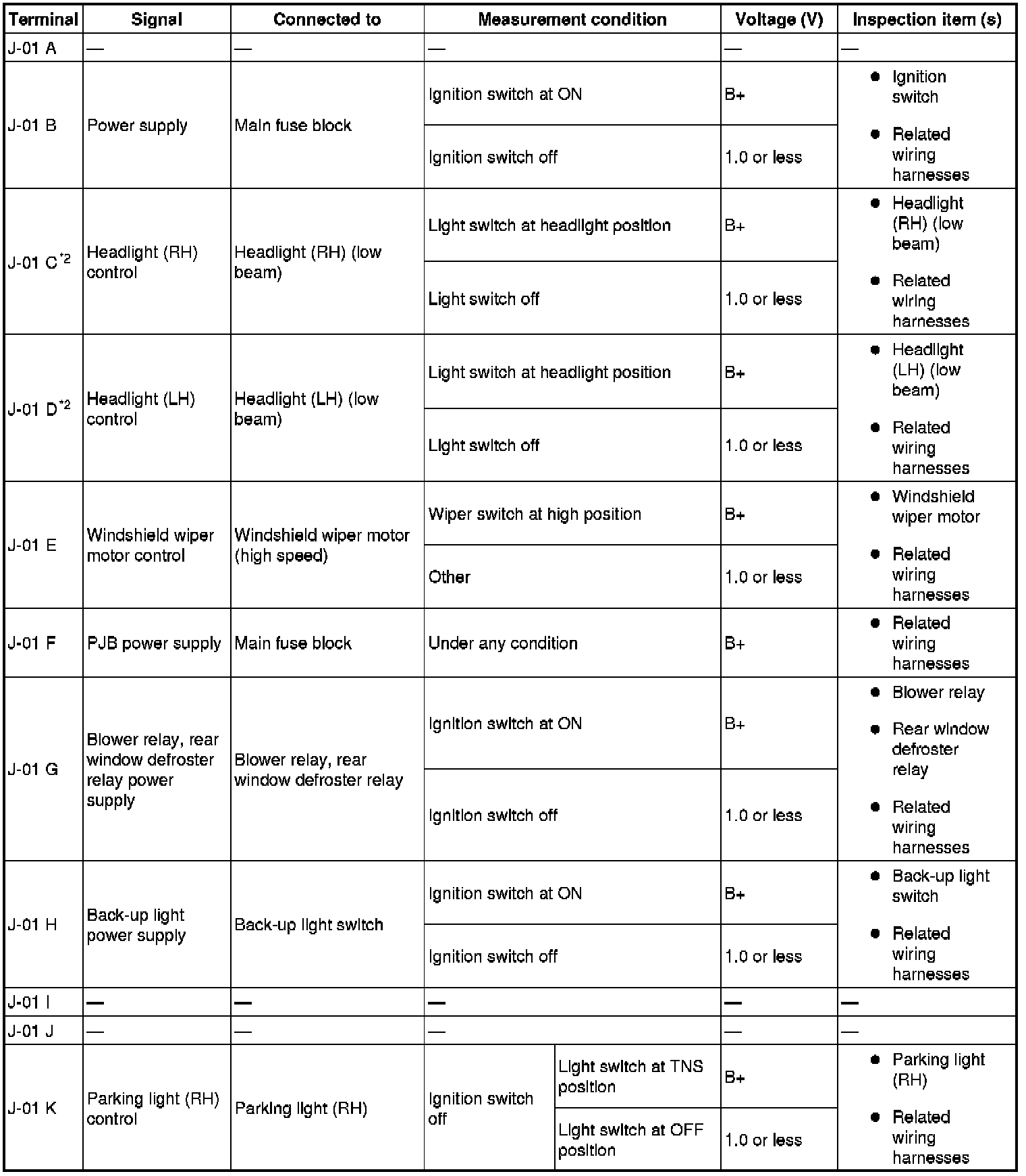 - If the voltage or continuity is not as specified in the Terminal Voltage Table (Reference), inspect the parts under "Inspection item (s)".
