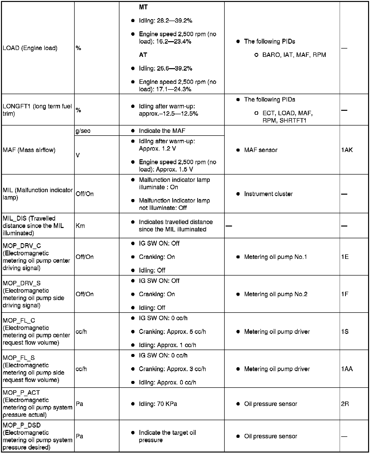PID/DATA monitor table (reference)