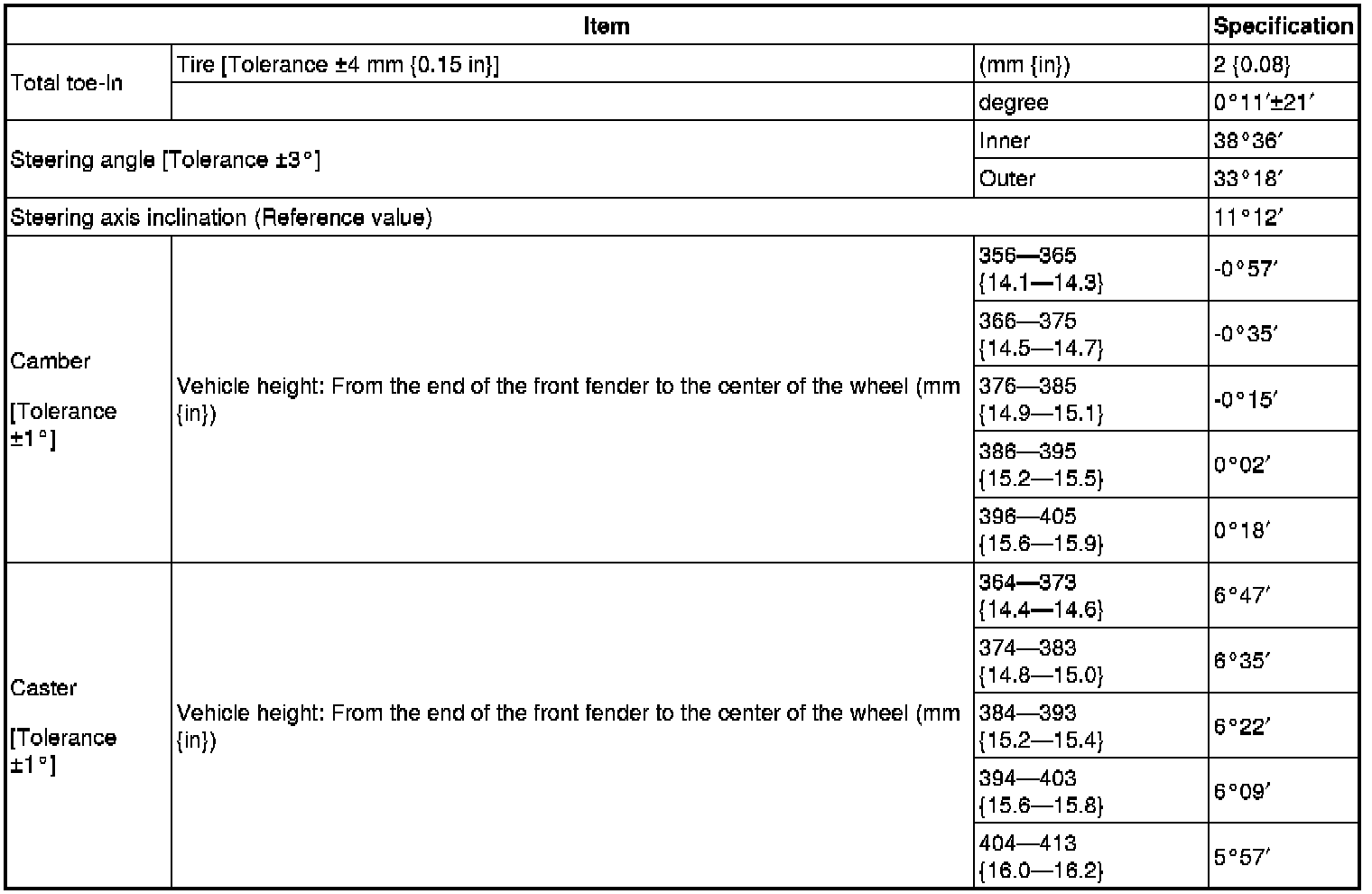- Difference between the left and right dimension for camber and caster is within 1°.