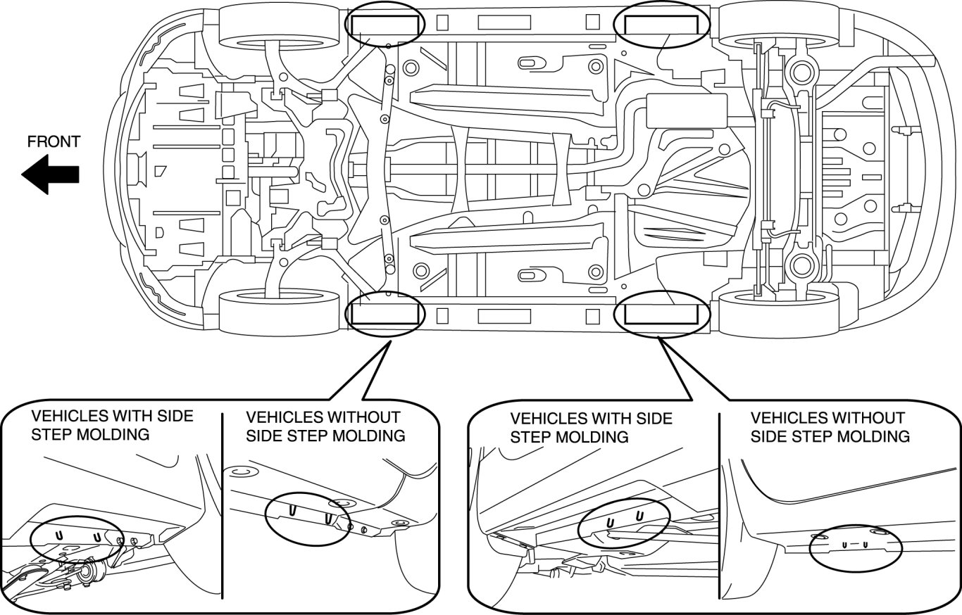 JACKING POSITIONS, VEHICLE LIFT (2 SUPPORTS) AND SAFETY STAND (RIGID RACK) POSITIONS
